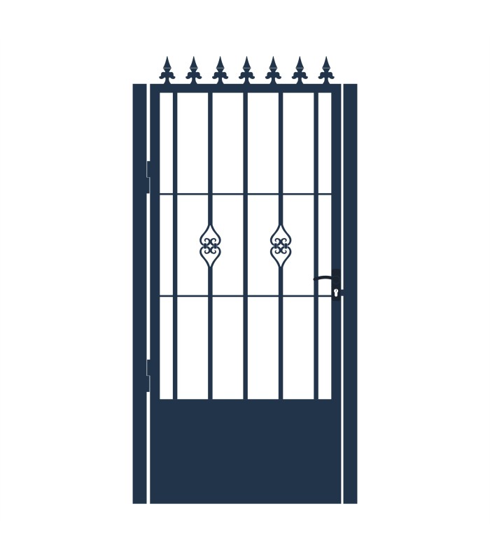 Puerta para Jardín con bastidor de tubo cuadrado de 40x40, barrotes verticales macizos de 16 mm y adornos de hierro forjado que aportan un toque clásico. Incluye pletinas horizontales y zócalo de chapa lisa de 50 cm para mayor robustez. Ofrece cerradura con manilla o cerradura eléctrica, adaptándose a diversas necesidades de seguridad.