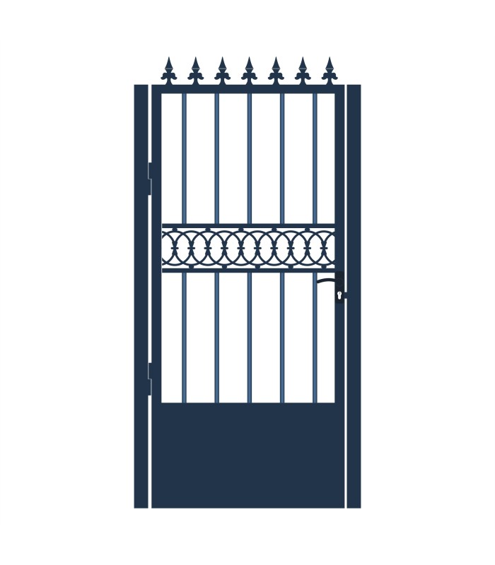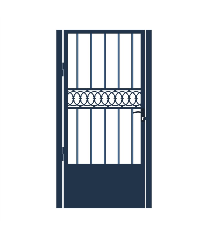 Puerta de jardín de diseño clásico con bastidor de tubo cuadrado de 40x40, barrotes verticales macizos de 16 mm y cenefa de hierro fundido en el centro. Incluye un zócalo de chapa lisa de 50 cm para refuerzo y protección. Ideal para garantizar seguridad y aportar un toque decorativo.