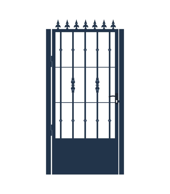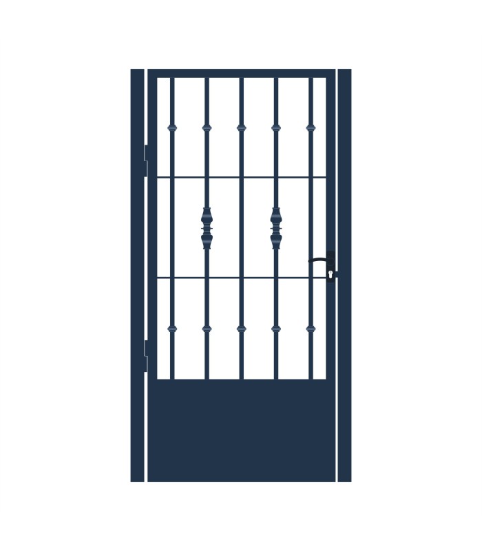 Puerta para jardín fabricada con bastidor de tubo cuadrado de 40x40 y barrotes verticales de cuadradillo macizo de 16 mm, decorados con macollas de hierro fundido. Incluye pletinas horizontales para reforzar la estructura y un zócalo de chapa lisa de 50 cm para mayor durabilidad. Ideal para añadir un toque tradicional sin perder robustez.