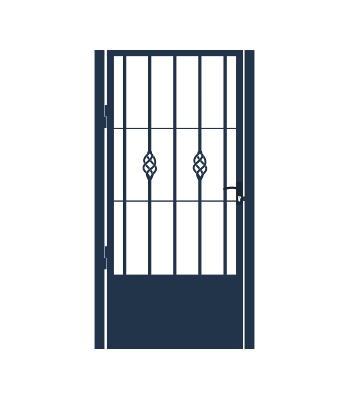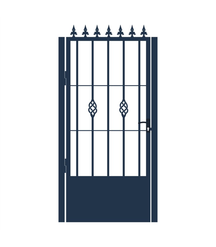 Puerta de jardín robusta y decorativa con bastidor de tubo cuadrado de 40x40, barrotes verticales macizos de 16 mm y piñas de hierro forjado intercaladas. Incluye pletinas horizontales para mayor rigidez y un zócalo de chapa lisa de 50 cm que protege la base. Ideal para asegurar y embellecer cualquier acceso.