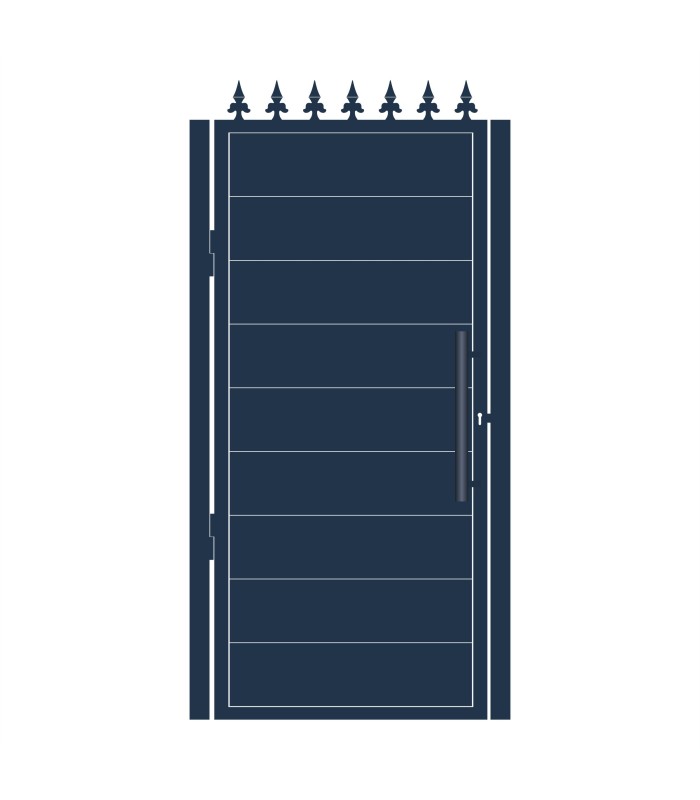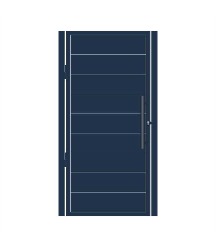 Puerta de Jardín con bastidor de tubo cuadrado de 40x40 y paneles de chapa de 1,5 mm plegados, unidos entre sí para formar rayas horizontales en la cara exterior. Ofrece opción de cerradura con manilla o cerradura eléctrica (incluye tirador vertical exterior y manilla interior) para adaptarse a diferentes necesidades de seguridad.