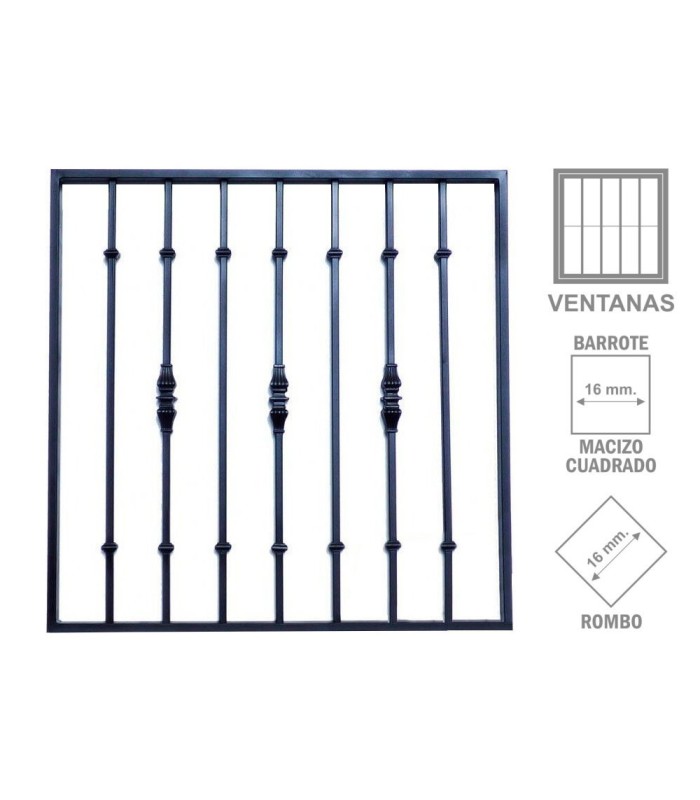 Fabricada con marco de tubo rectangular de 40x20, barrotes de cuadrado macizo de 16 mm. con macollas de hierro fundido, y pletinas horizontales de 40x6 atravesadas por los barrotes cuando la medida de la reja sea de 1 metro o mas de alta.