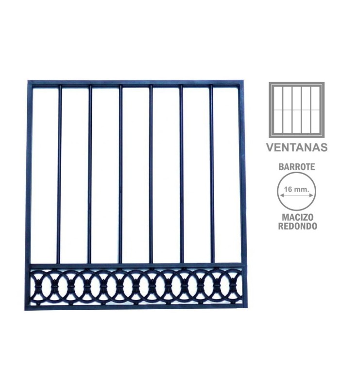 Fabricada con marco de tubo rectangular de 40x20, barrotes de varilla de 16 mm. y cenefa de hierro fundido en la parte inferior de la reja.